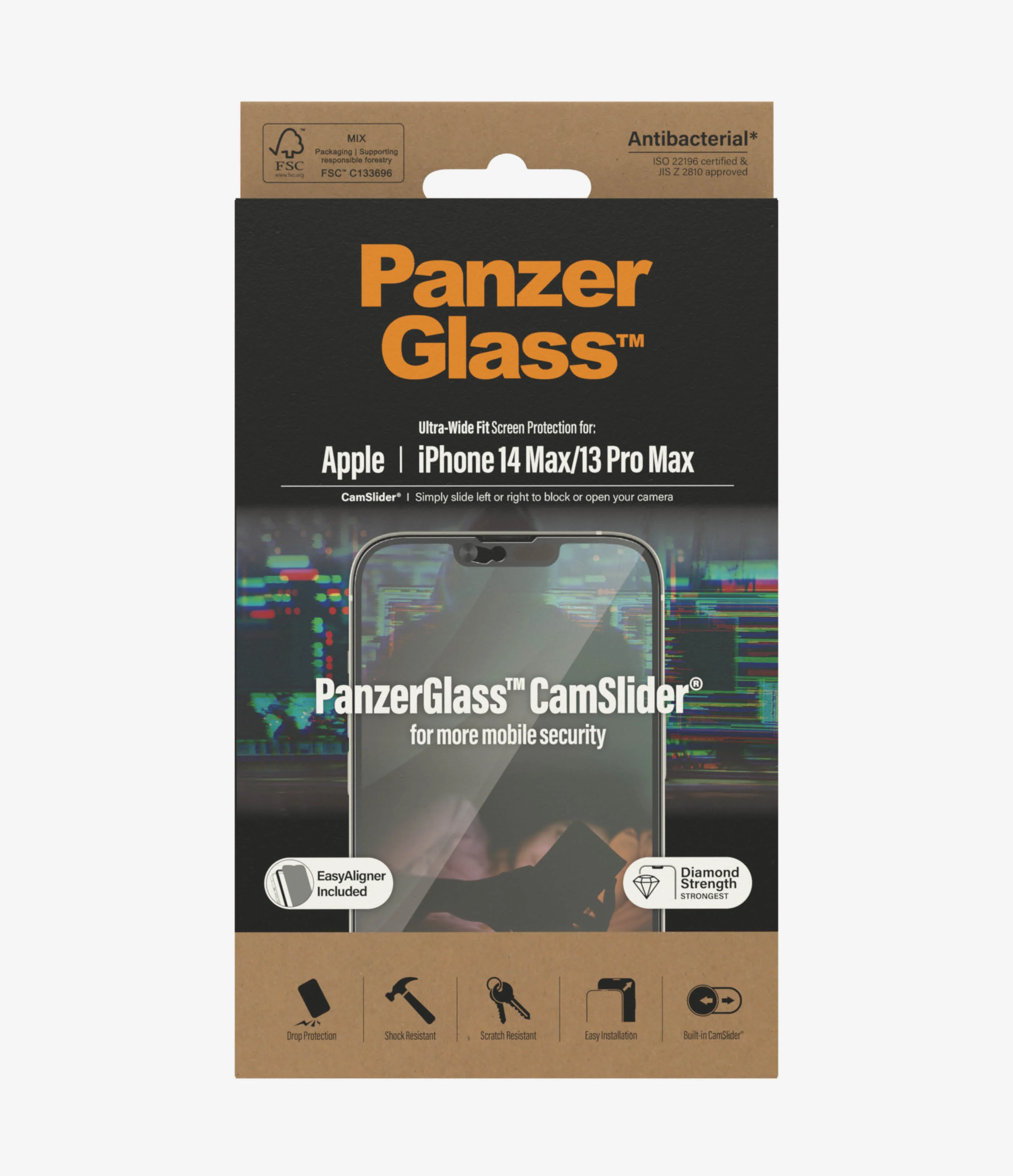 PanzerGlass™ for iPhone 14 Plus and 13 Pro Max is a case-friendly screen protector made of flat tempered glass and covers the entire front surface of the device. The glass features full silicone adhesive which is carefully optimised to match the screen and features a smooth built-in camera cover.